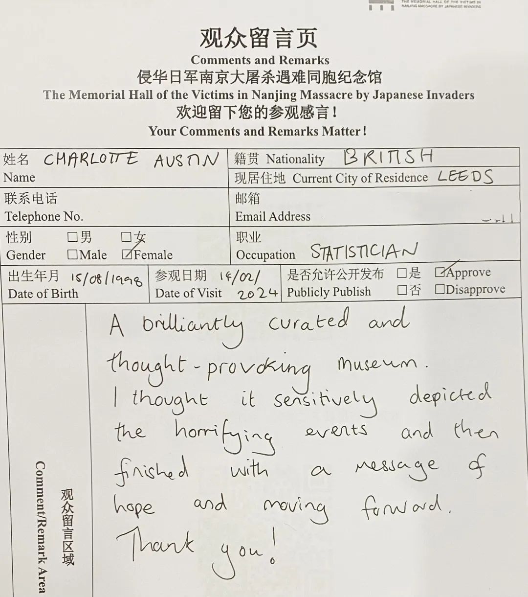 来自英国的观众写道:“这是一个精心策划且发人深省的博物馆,我认为它细致地描绘一件令人恐惧的事件,最后纪念馆传达了希望和不断向前的美好祝福。”