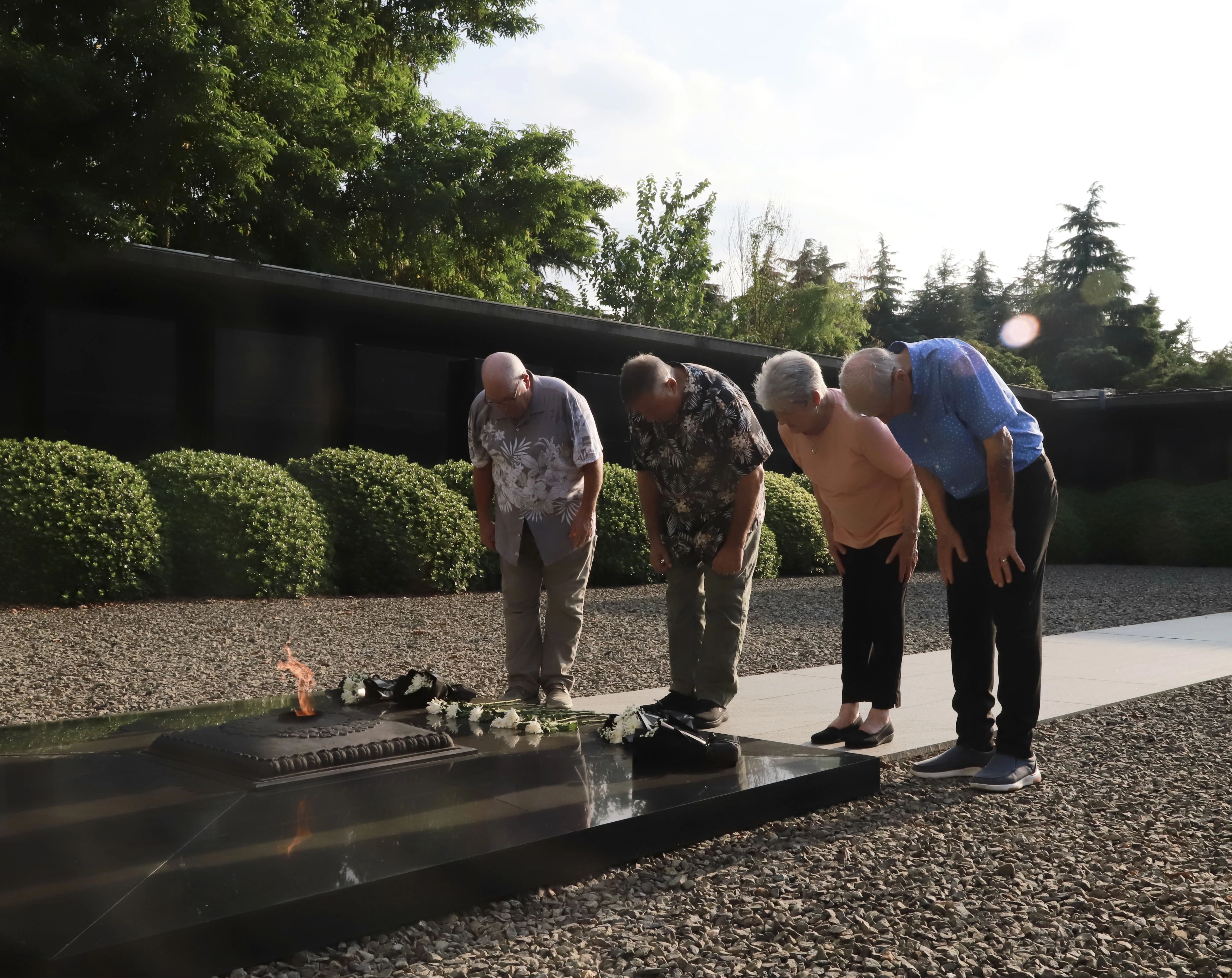随后,一行人来到了“万人坑”。玛格丽特·金坎农是美中航空遗产基金会副主席,也是飞虎队第14航空队B-25轰炸机机上炮手詹姆斯·米尔斯的女儿,她说:“我看见‘万人坑’里孩子的遗体被日军随意地丢弃,这令我印象深刻,也让我的内心非常悲伤。”在“祭场”长明火处嘉宾们共同向南京大屠杀死难者献上白菊,鞠躬致哀。