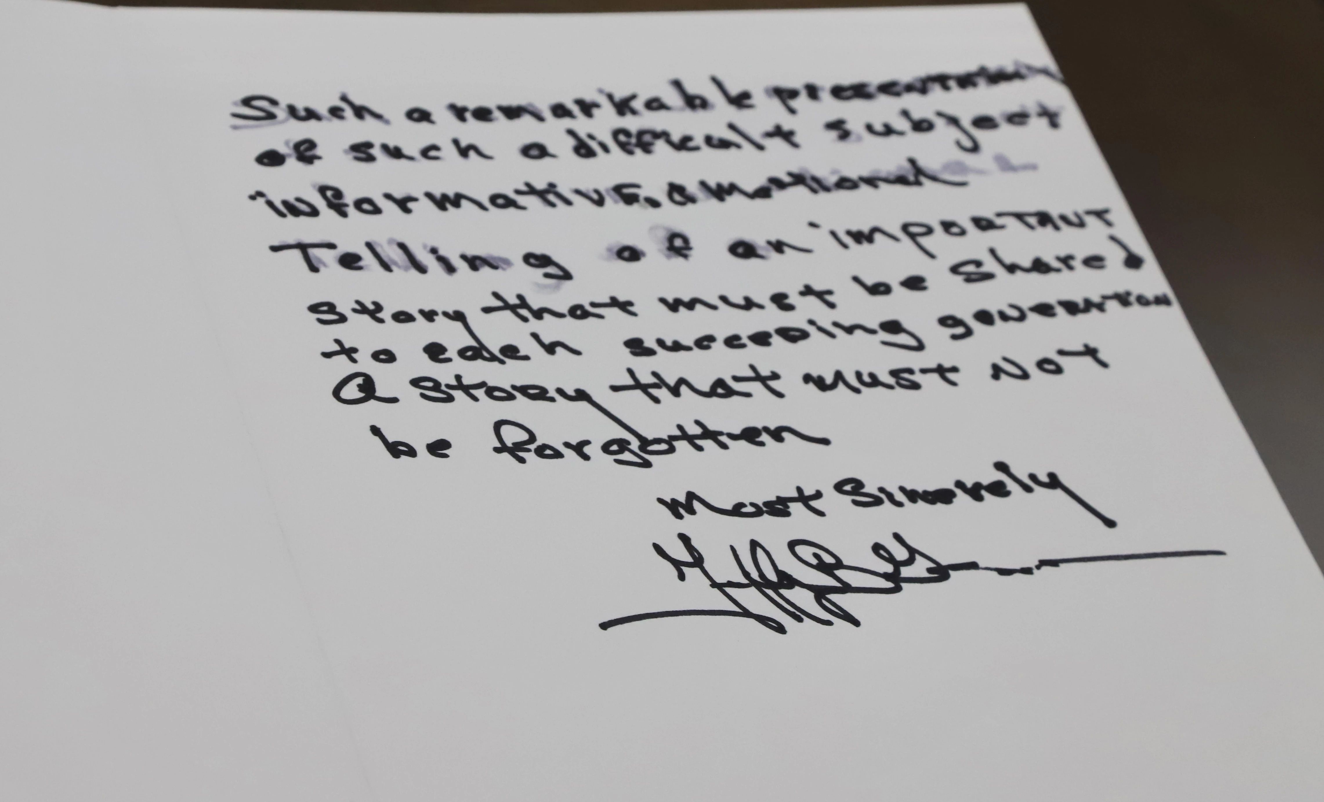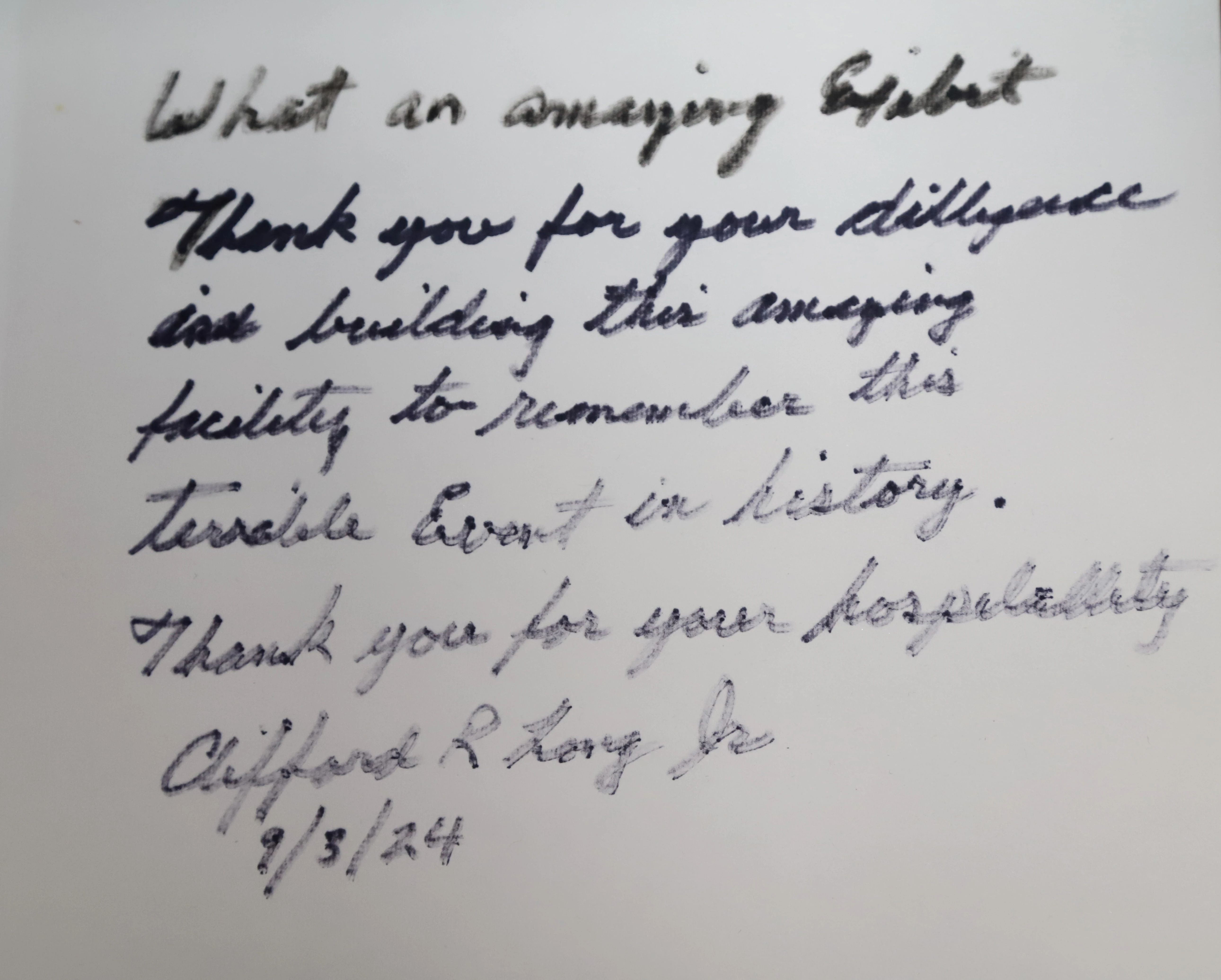 参观结束后,大家也纷纷写下了自己的参观感受。美中航空遗产基金会副主席,飞虎队第14航空队P-40战斗机飞行员之子克利福德·朗写道:“多么了不起的展览啊!感谢你们为铭记南京大屠杀历史而建造这一座纪念馆。”