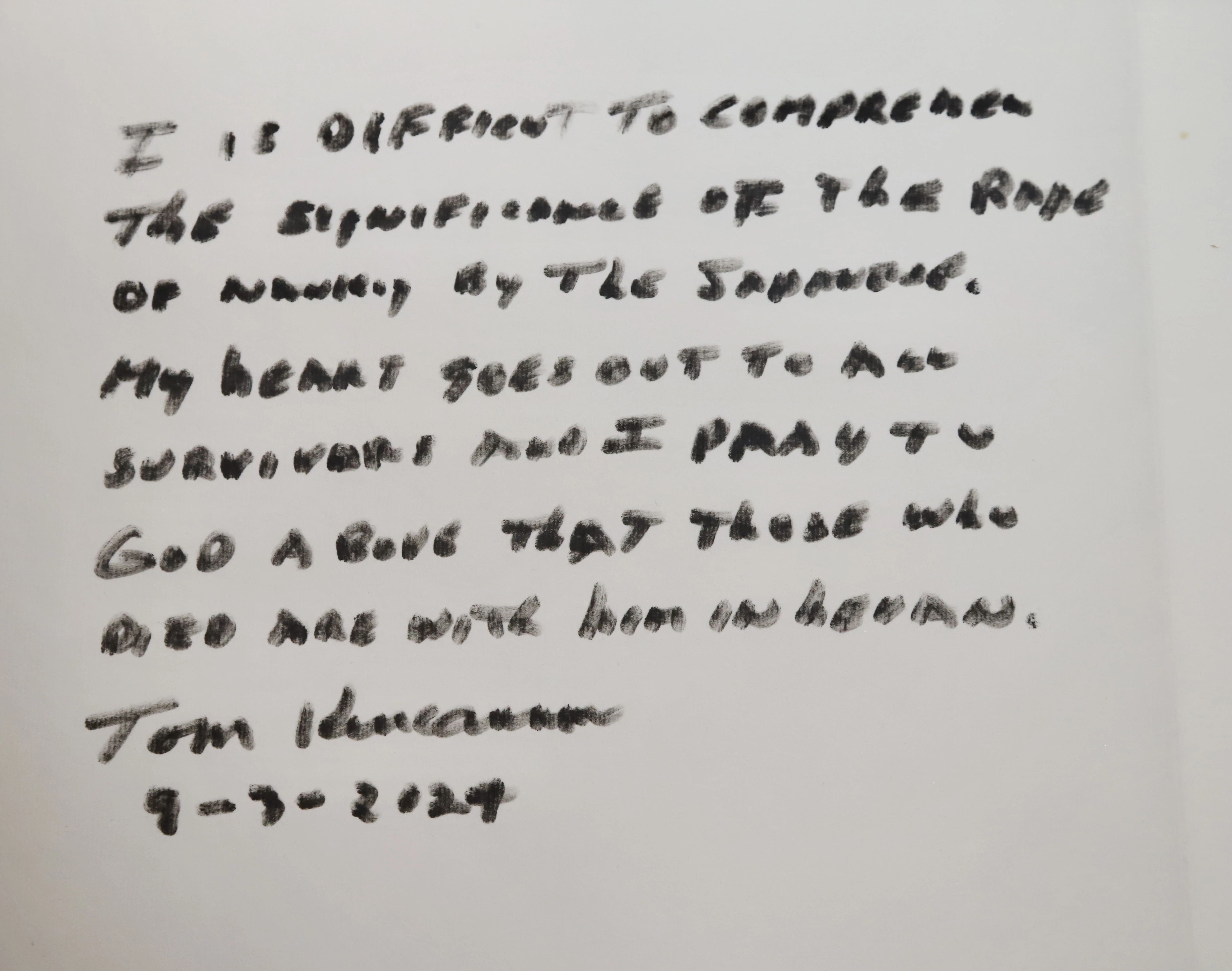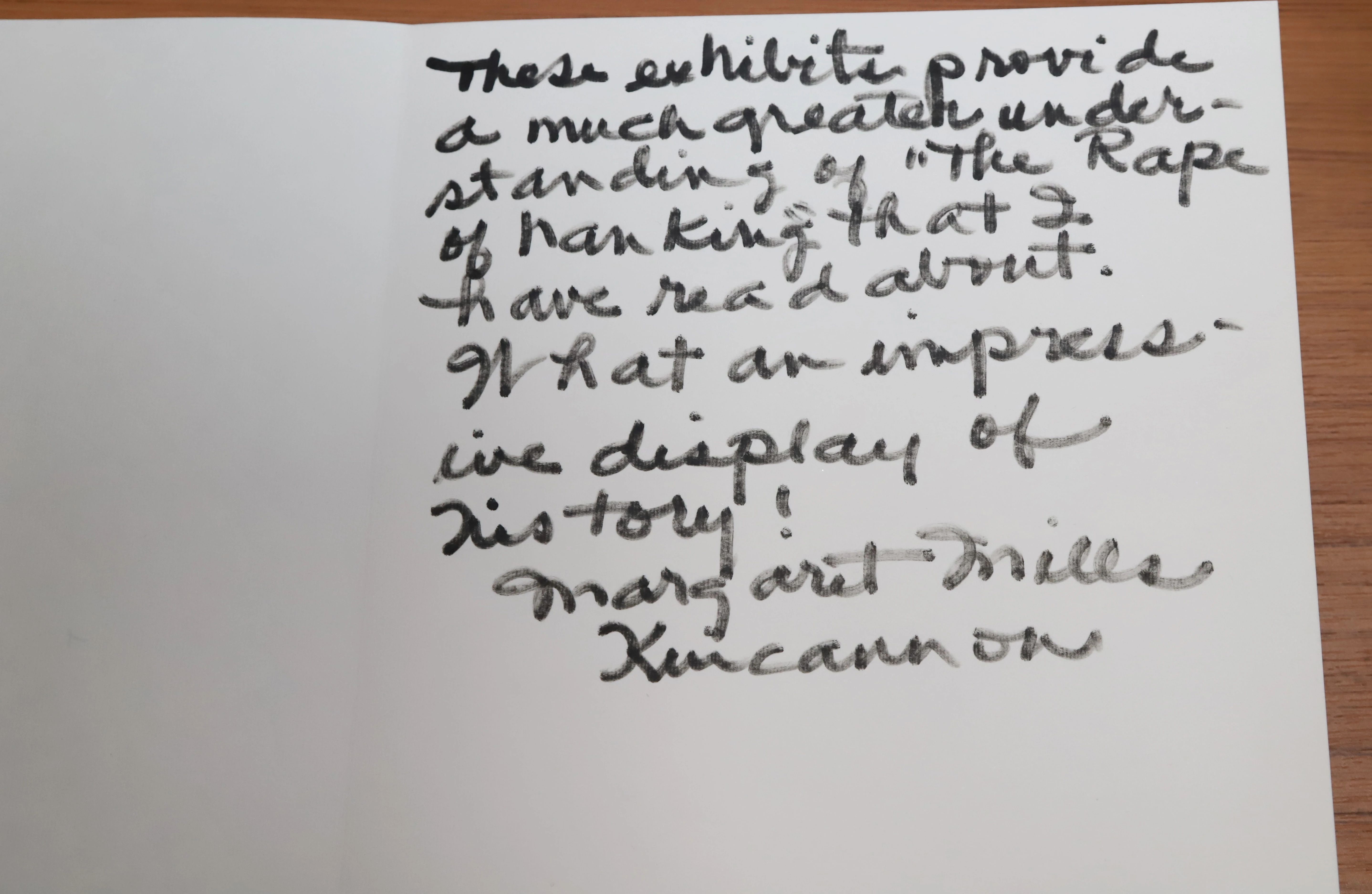 托马斯·金坎农是玛格丽特的丈夫,也是美中航空遗产基金会顾问,美国前海军水手,他在来此之前了解过南京大屠杀的相关报道,常觉内心不能平静,他说这对于他来说太过压抑,他很感谢纪念馆所做的一切,也同样希望自己能做一些事情来帮助纪念馆。他写下:“学习和了解南京大屠杀史非常重要。我的心与所有幸存者同在。”玛格丽特·金坎农写道:“这次参观让我对南京大屠杀有了更深刻地理解。纪念馆对历史的展示令人印象深刻!”