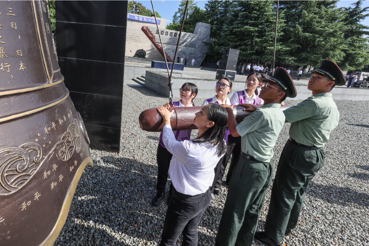 南京大屠杀记忆传承人代表、紫金草志愿者代表、军校学生代表等共6人撞响和平大钟,大家在钟声里铭记历史、珍爱和平。面向和平大钟,来自南京大学新闻传播学院的紫金草志愿者梅雨潇紧紧握着钟槌,她说:“回荡在耳畔的钟声是对遇难者的告慰,更是以史为鉴、珍爱和平的警醒。作为新时代青年,自己要不忘历史,努力学习,成长为对国家有用的人。”