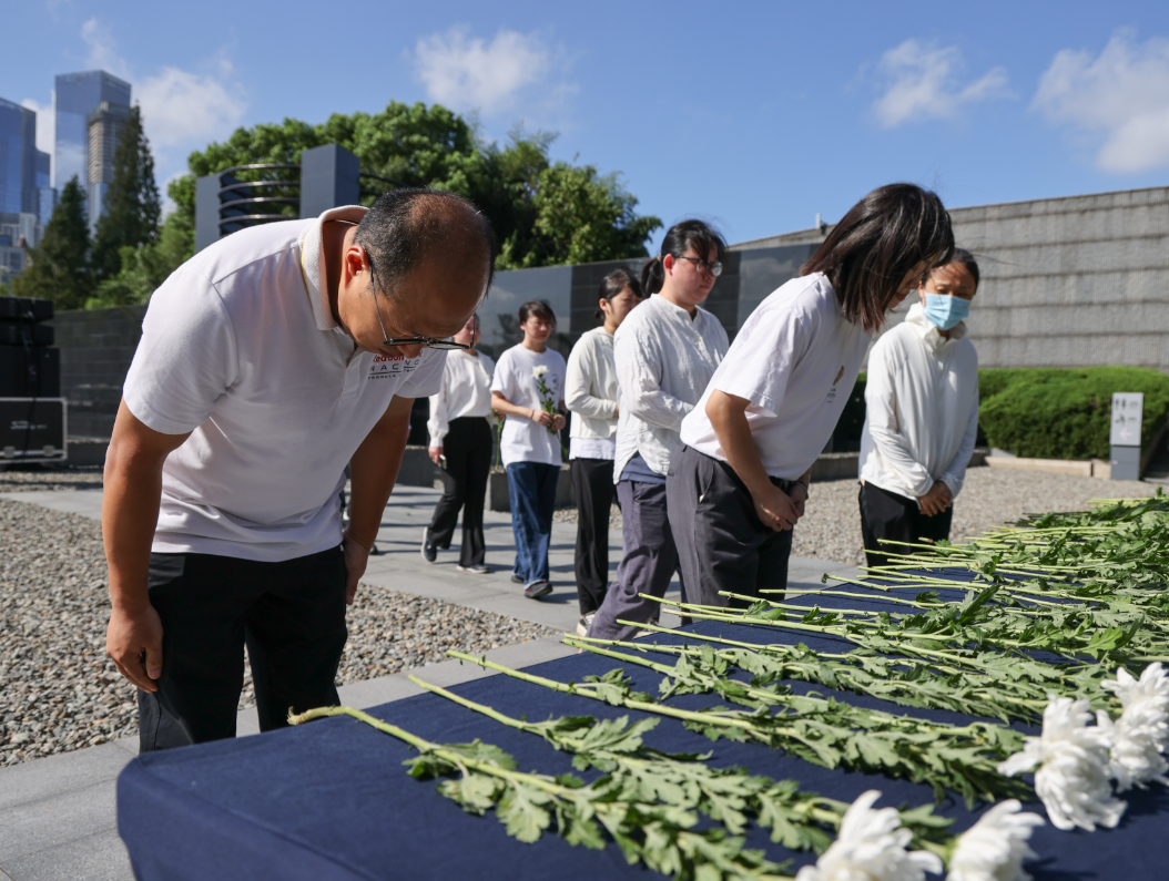 纪念馆向南京大屠杀中的无辜死难者、惨遭日本侵略者杀戮的死难同胞、为中国人民抗日战争胜利献出生命的革命先烈和民族英雄、同中国人民携手抗击日本侵略者而献出生命的国际战士和国际友人敬献花篮,全体人员依次向前敬献鲜花。