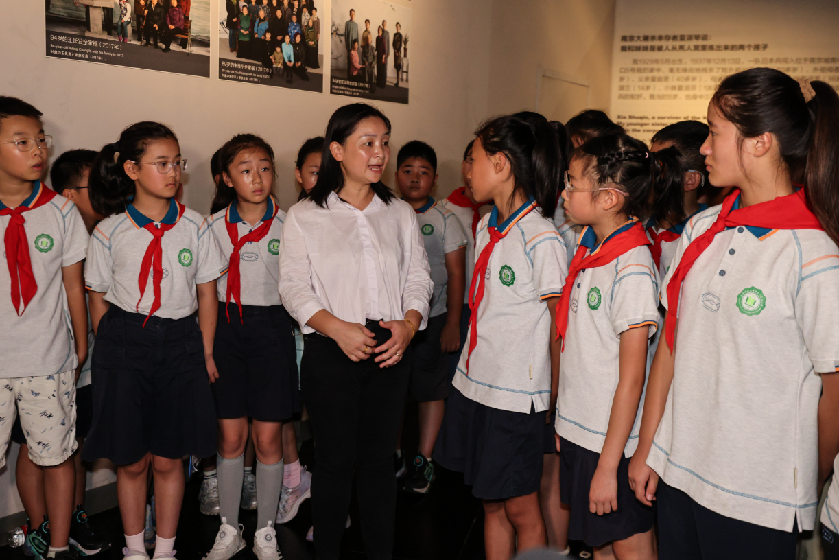 仪式结束后,首批南京大屠杀历史记忆传承人、南京大屠杀幸存者夏淑琴的外孙女夏媛来到《南京大屠杀史实展区》展厅内的夏淑琴全家福前,为孩子们讲述1937年,夏淑琴一家九口中有七口人惨遭侵华日军屠杀身亡的不幸遭遇。