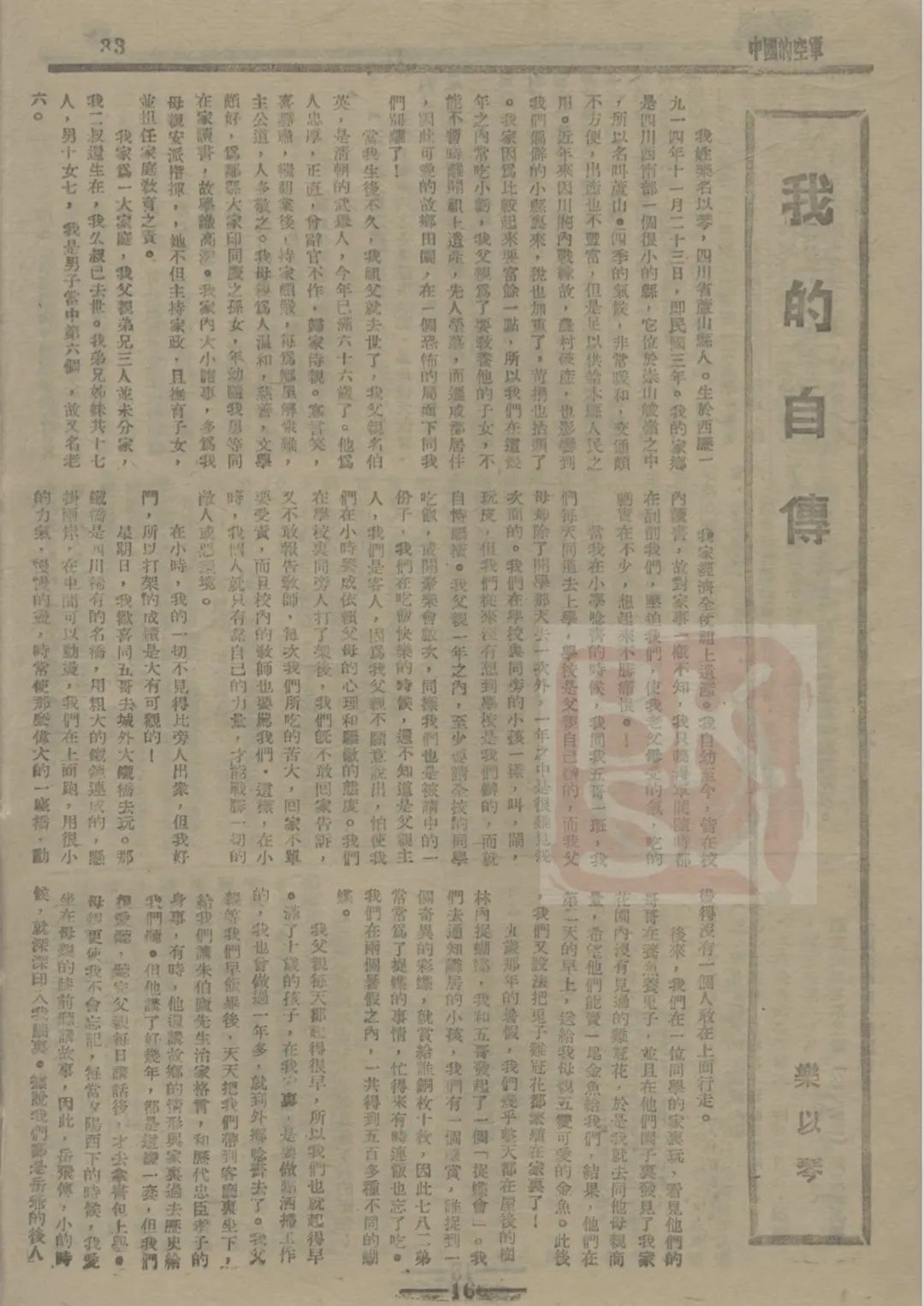 乐以琴撰写的《我的自传》刊登于1940年《中国的空军》期刊,图为节选