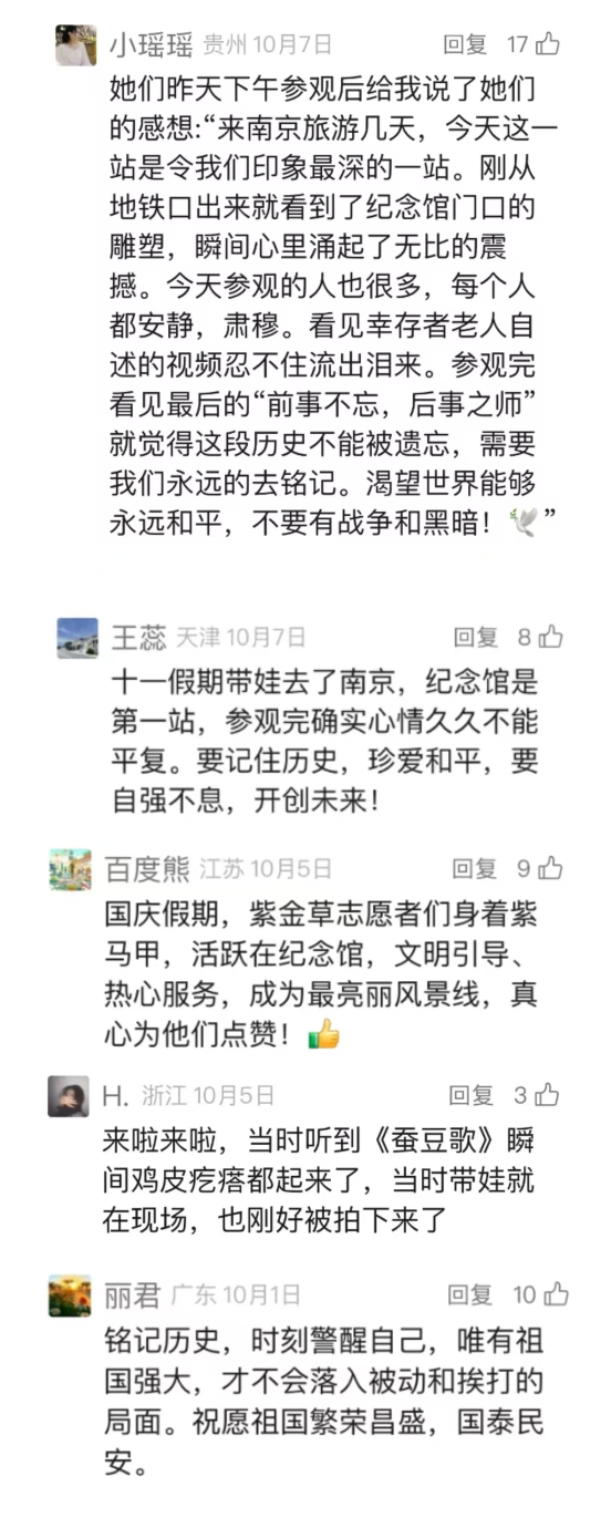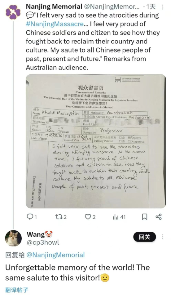 10月12日,一名来自澳大利亚的教授留言:“看到南京大屠杀期间的暴行,我感到非常难过。与此同时,我为中国的士兵和公民感到骄傲,看到他们如何捍卫自己的国家和文化。我向过去、现在和未来的所有中国人致敬。”网友留言:“不能忘却的世界记忆!同样向这位参观者致敬!”