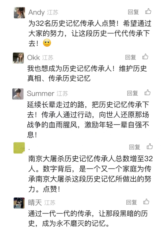 今年重阳节,工作人员和志愿者们上门慰问南京大屠杀幸存者,第三批南京大屠杀历史记忆传承人上岗。截至目前,南京侵华日军受害者援助协会登记在册在世的南京大屠杀幸存者仅剩32人,历史记忆传承人总数增至32人。两个“32”背后,是一个又一个家庭为传承历史记忆所做出的努力,一代又一代年轻人用实际行动接替先辈,将历史告诉世界。
