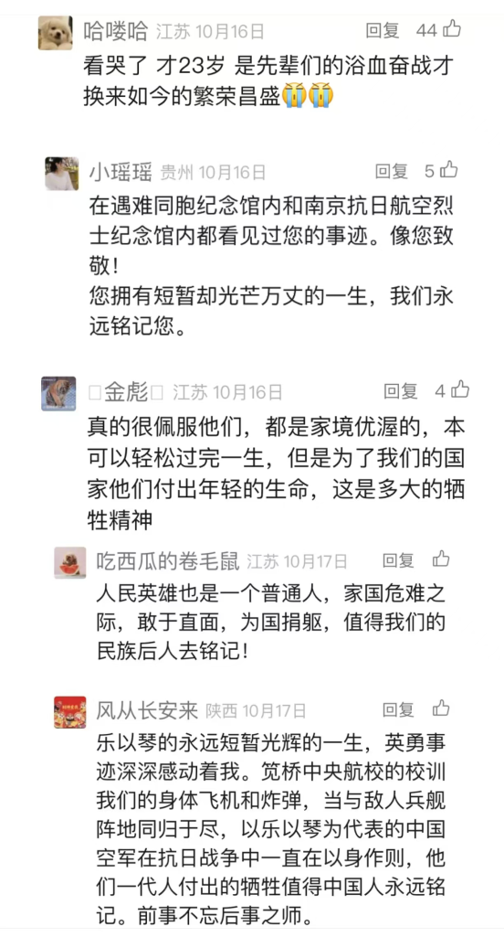 10月16日,抗战英烈乐以琴的后人分别从美国、四川赶赴南京,寻访亲人的足迹,为我们还原他的一生。1937年12月3日,乐以琴在击落敌机后以身殉国,年仅23岁。许多网友被他的故事打动,纷纷留言。