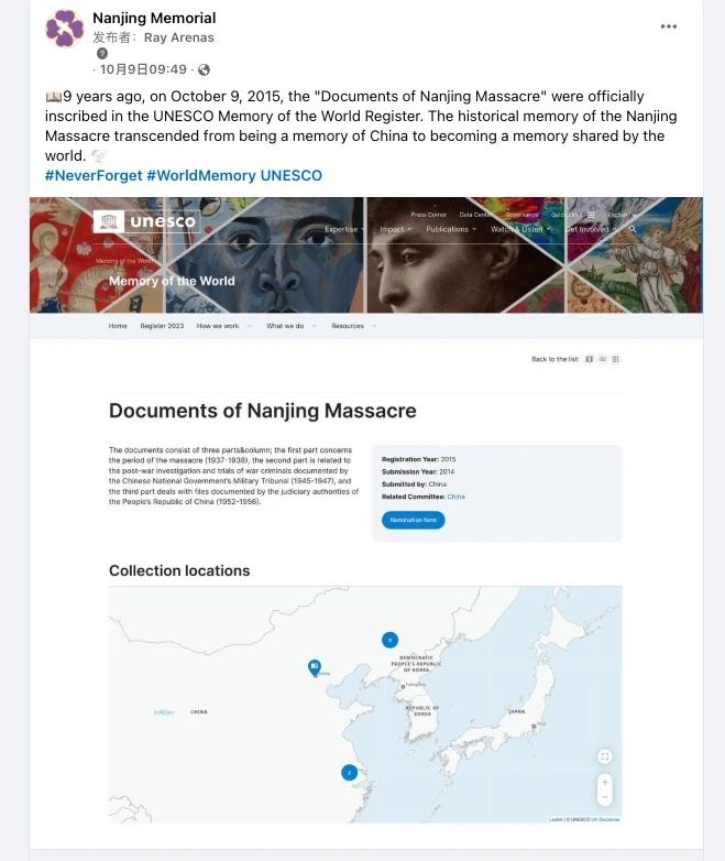 2015年10月9日,《南京大屠杀档案》入选联合国教科文组织的《世界记忆名录》,南京大屠杀从南京记忆、中国记忆上升成为世界记忆。我们在“Nanjing Memorial”(南京祭忆)发布推文,让海外网友了解南京大屠杀历史。