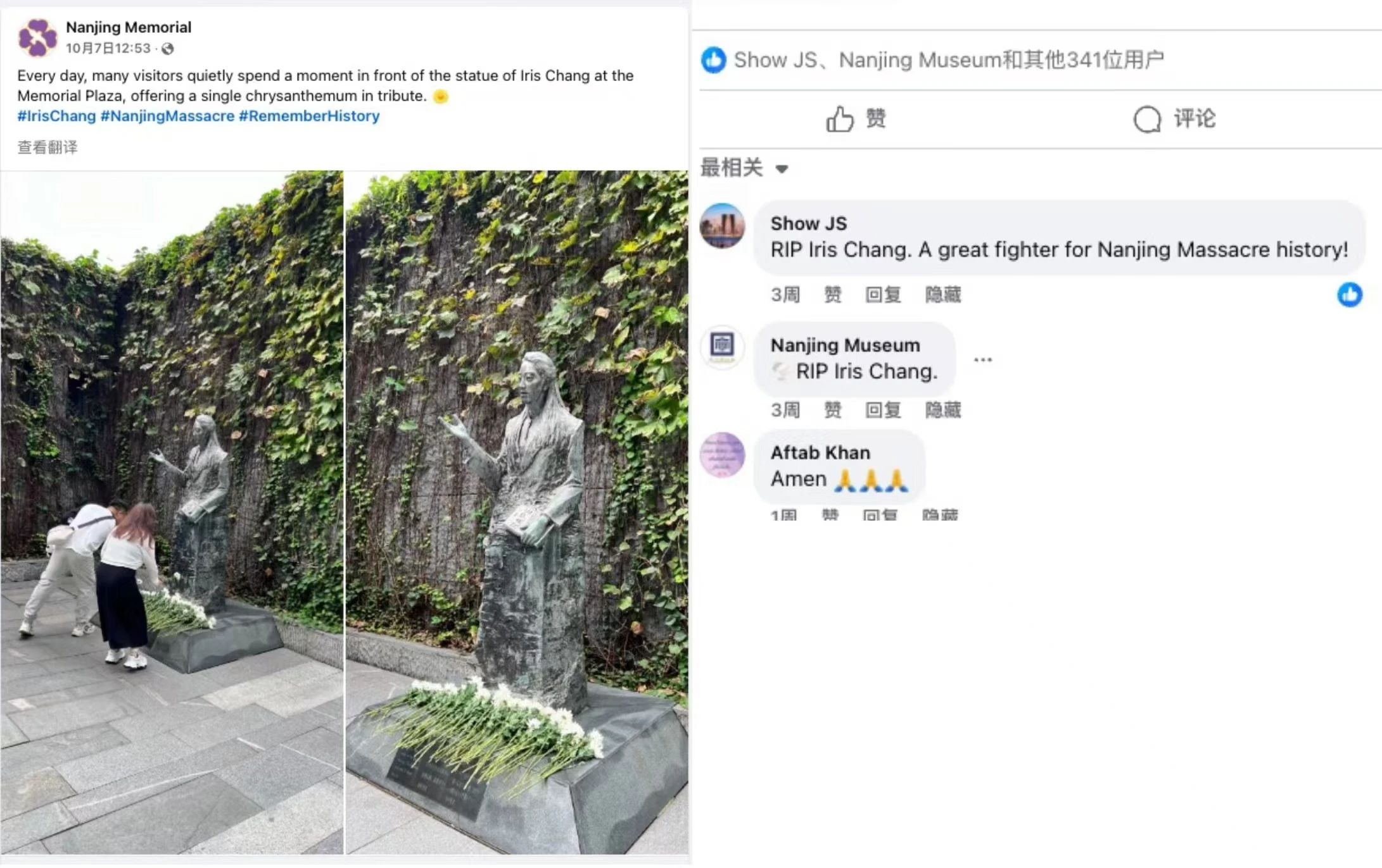 在一条观众给张纯如雕像献花的推文下,许多海外网友留言:“致敬张纯如,一位勇敢的战士!”