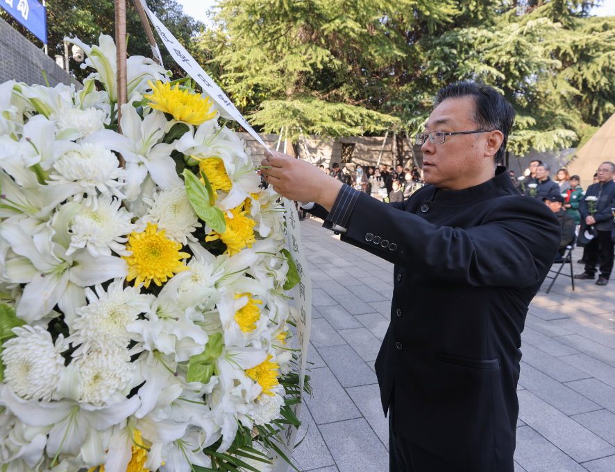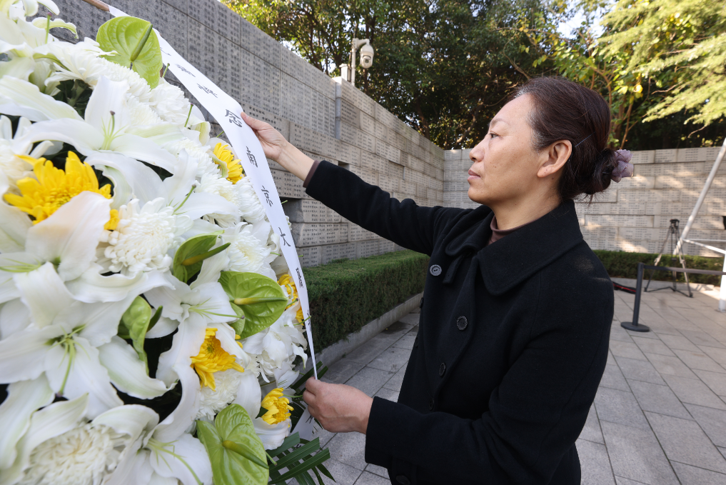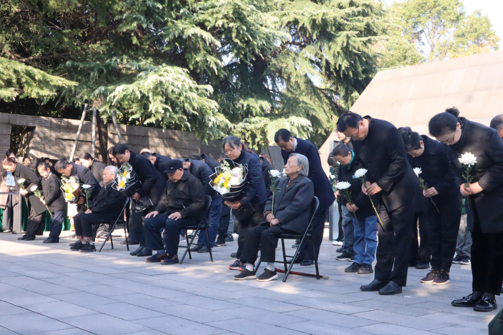 纪念馆馆长周峰和南京大屠杀死难者遗属代表阮红燕整理挽联,全体人员手持菊花向南京大屠杀死难者三鞠躬。