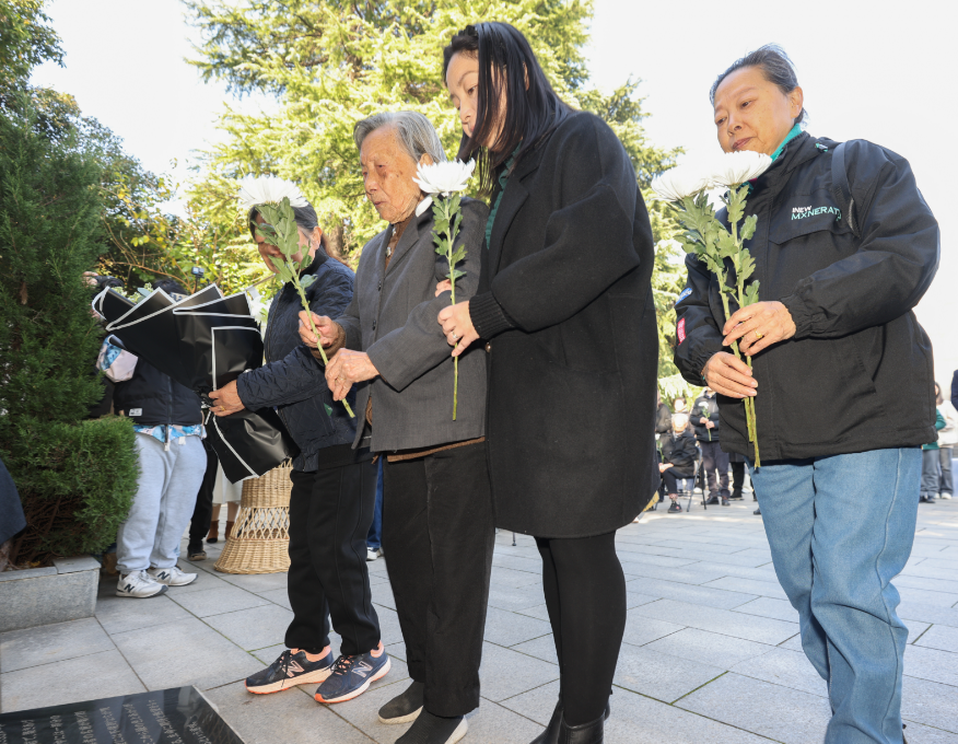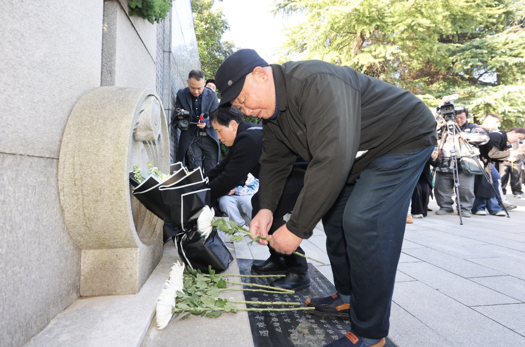 初冬的“哭墙”前,有无尽的哀思。12月1日,南京大屠杀死难者家庭祭告活动在侵华日军南京大屠杀遇难同胞纪念馆遇难者名单墙前举行。南京大屠杀幸存者、幸存者后代和死难者遗属代表,以及青少年代表手持菊花肃立,祭奠在87年前遇难的亲人和同胞。