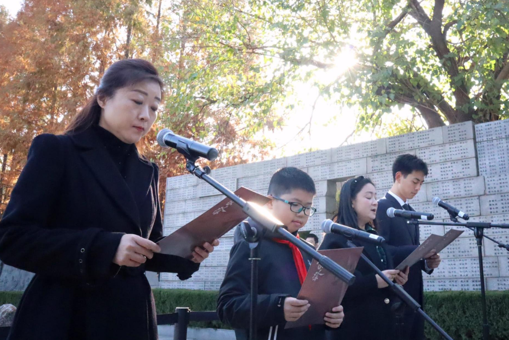 南京大屠杀历史记忆传承人任颖、于恬祥、夏媛、蒋秉錞,用缓慢而低沉的声音接力诵读诗人冯亦同撰写的诗歌《江东门的钟声》,表达对30万无辜而鲜活的生命惨遭日军杀害的深切悼念。