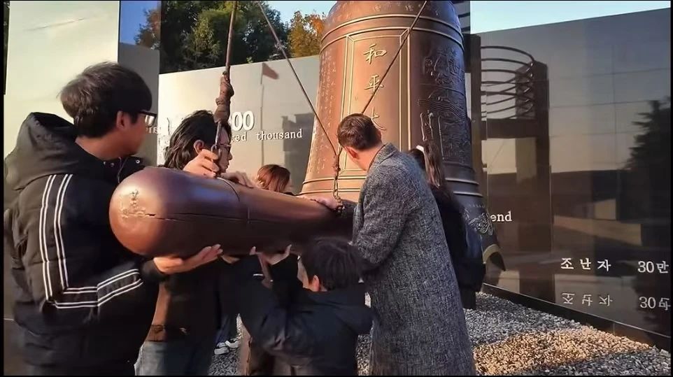 美国小伙埃文·凯尔等12位观众分两组,先后撞响和平大钟13下,寓意铭记一个特殊的日子——1937年12月13日。