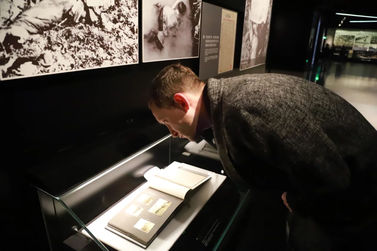 在尾厅介绍“京字第一号证据”相册的视频前,埃文停下来,表情凝重地看着视频中播放的16张日军拍摄的屠杀、侮辱和抢劫中国平民的暴行照片。