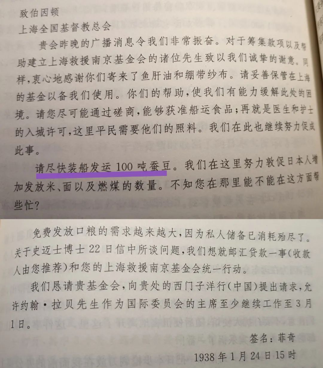据《拉贝日记》记录,收到广播消息后,24日15时,菲奇再致上海全国基督教总会,再次提到“请尽快装船发运100吨蚕豆。”
