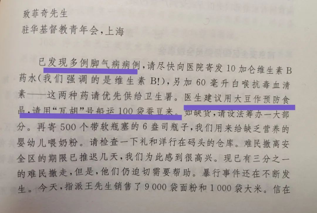 2月6日,《拉贝日记》收录了史迈士致位于上海的菲奇先生的电报。其中提到“已发现多例脚气病病例,医生建议用大豆作预防食品,请用‘瓦胡’号船运100袋蚕豆来。”