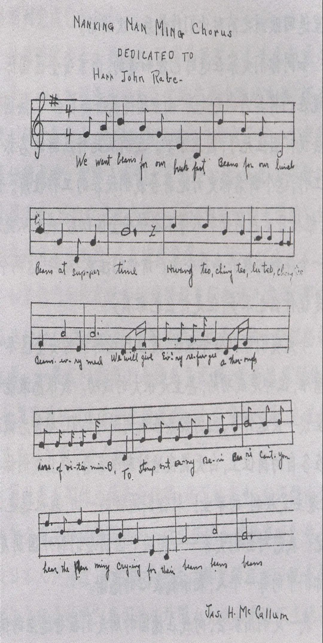 2月21日,《拉贝日记》中介绍了美籍牧师麦卡伦创作的《南京难民合唱曲》,并贴了曲谱:“我缺少音乐才能多么遗憾。麦卡伦牧师先生为表示对我的敬意谱写了一首《南京难民合唱曲》,还为此写了歌词:‘We want beans for our breakfast,beans for our lunch……’(渴望用蚕豆做早餐,蚕豆做午餐……)我一点都不知道,在这个几乎被日本人刺死的神秘老牧师身上有那么多的幽默。”