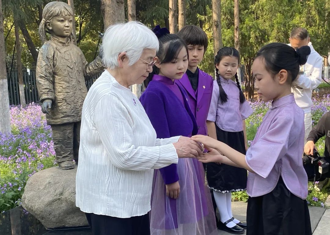 大门高子与孩子们围坐在紫金草女孩铜像前交流