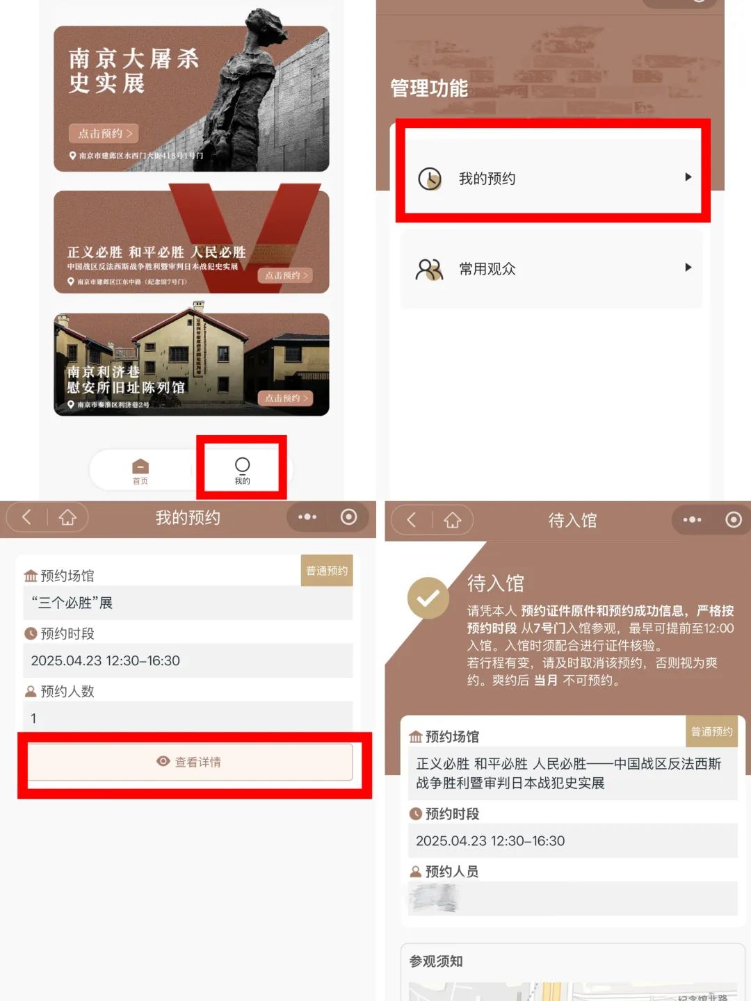 1.预约订单提交成功后纪念馆将尽快为您审核,请您于“我的预约—查看详情”留意您的审核结果。“待入馆”状态表示预约成功,您可凭本人身份证件原件入馆;“待审核”状态表示您提交的优待信息还在审核中,暂时无法入馆;“审核不通过”状态表示您的优待信息未通过审核,请根据未通过原因调整后重新上传。
