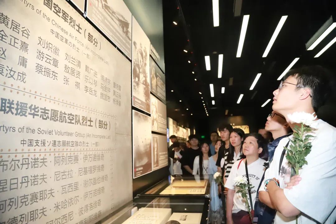 观众驻足在我馆介绍苏联援华志愿航空队的展板前观看