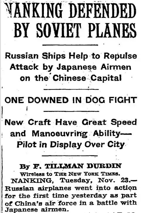 当天,英国路透社的电讯报道了在南京空战中“击落日机一架”。次日,美国《纽约时报》驻南京记者报道了《苏联飞机保卫南京》。
