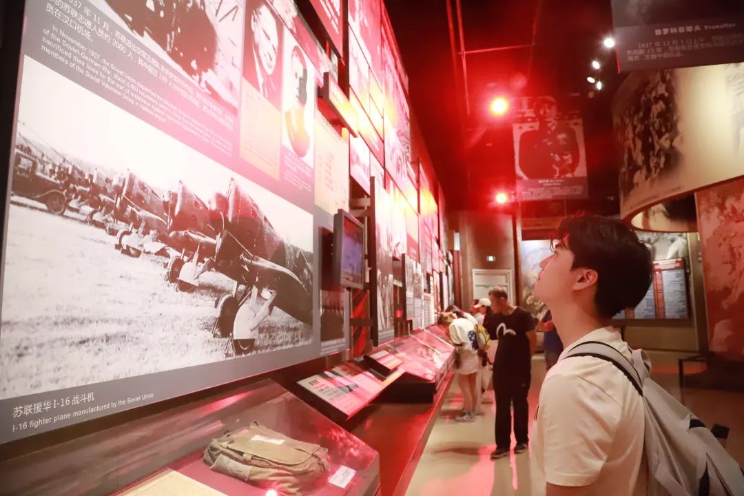 观众驻足在我馆“三个必胜”展厅中介绍苏联援华志愿航空队的展板前观看