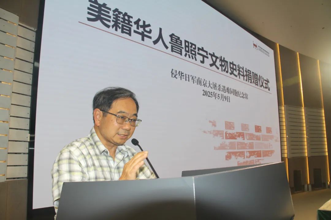 中共南京市委宣传部副部长、纪念馆馆长周峰代表纪念馆,接受鲁照宁捐赠的文物史料,并颁发收藏证书。