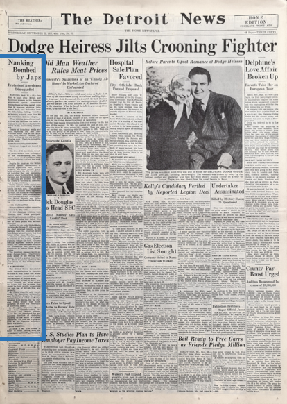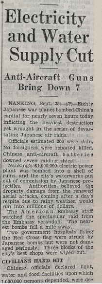 1937年9月25日《底特律新闻》头版报道:“今天,80架日本战机对中国首都进行了近7小时的轰炸,造成了日军空袭以来最严重的破坏……南京价值100万美元的发电厂被轰炸成一片废墟,城市供水系统也因日军炸弹而瘫痪……一百万人赖以生存的照明、供水和食品设施被日军摧毁……”