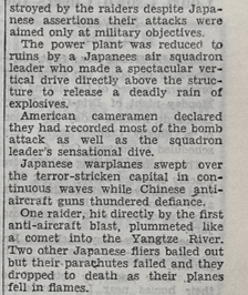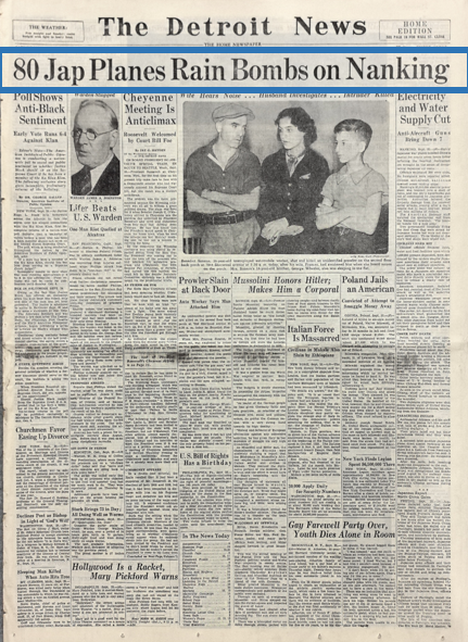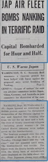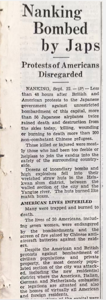 1937年9月22日的《底特律新闻》报道:“今天超50架日本飞机再度从空中带来死亡与破坏,造成200多名中国平民伤亡。死伤人员大多是那些无力或无法加入逃往周边乡村安全地带行列的人。”
