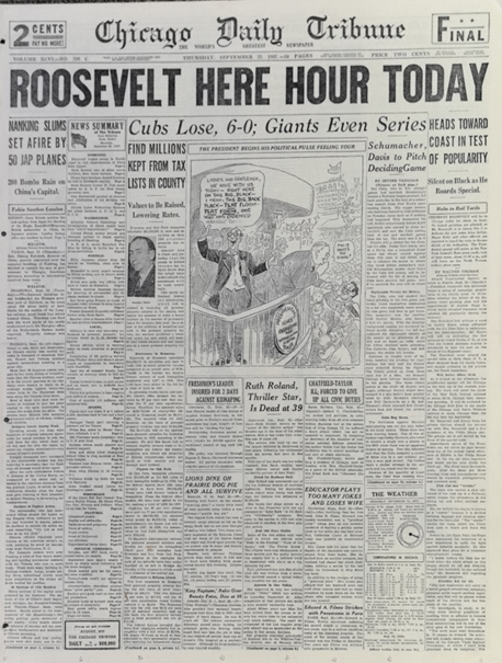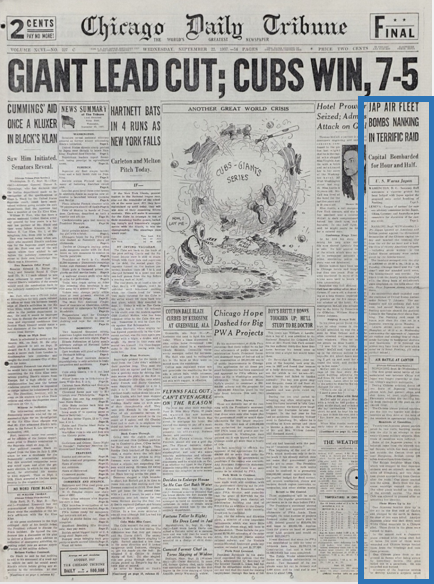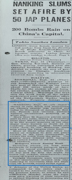 1937年9月22日《芝加哥每日论坛》头版转载美联社报道称:“日本无视美国和英国的抗议,于今日对这座人口密集的城市进行了恐吓性轰炸,并轰炸了一个半小时……轰炸机于周二上午10点30分和下午1点35分,在这座拥有百万人口的城市上空投弹,轰炸极其猛烈。”