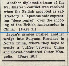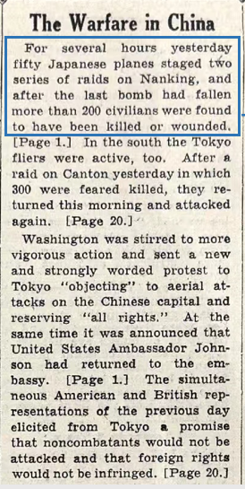 1937年9月23日《纽约时报》头版报道称:“昨天,50架日本飞机对南京进行了长达数小时的两轮空袭。在最后一枚炸弹落下后,超过200名平民伤亡。”