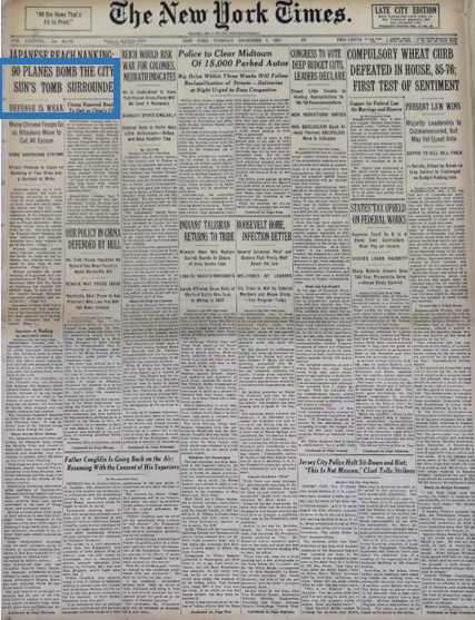 1937年12月7日,日军逼近南京城。当天,《纽约时报》头版报道:“因未能按计划今早进入南京城,愤怒的日军出动了90架飞机,据信这是有史以来规模最大的空袭。不过,空袭结果尚不明了。数百枚炸弹投下,造成了极大混乱……”