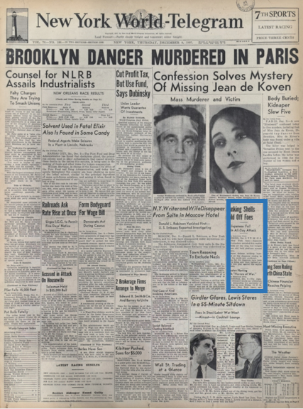 1937年12月9日《纽约世界电讯》头版报道:“9日晚上7点——日军空袭部队对中国首都进行了一整天的轰炸,但今晚中国军队仍坚守在南京城周边阵地。中国防御炮火对从南面和东南面逼近的日军进行了猛烈炮击……日军司令部今日发出最后通牒,要求南京在周五中午前投降。”