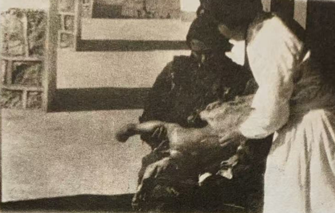 “这个小男孩从吴淞逃到常州,被经过常州的日本部队抓走。他当年十三四岁,已经为日本部队干了3个星期活。在他们两天不给他吃饭之后,他于12月26日恳求他们放他回家,他得到的回答就是挨刺刀戳和铁棍往头上一顿打。这个画面是他被送进鼓楼医院时拍摄下来的,当时他正血流如注。后来他痊愈了。”——《拉贝日记》