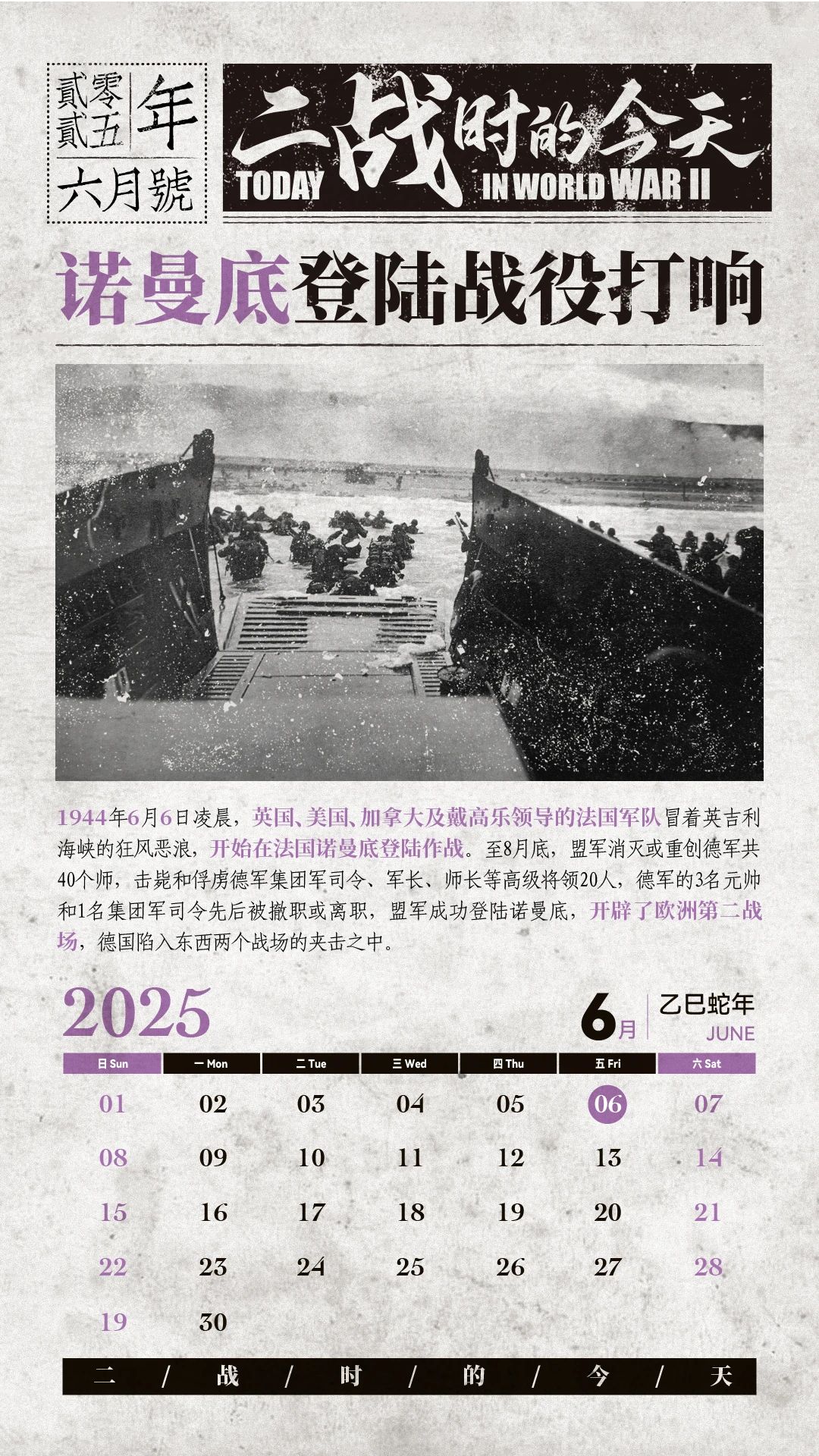 二战日历 | 诺曼底登陆战役打响 1944年6月6日凌晨,英国、美国、加拿大及戴高乐领导的法国军队冒着英吉利海峡的狂风恶浪,开始在法国诺曼底登陆作战。至8月底,盟军消灭或重创德军共40个师,击毙和俘虏德军集团军司令、军长、师长等高级将领20人,德军的3名元帅和1名集团军司令先后被撤职或离职,盟军成功登陆诺曼底,开辟了欧洲第二战场,德国陷入东西两个战场的夹击之中。