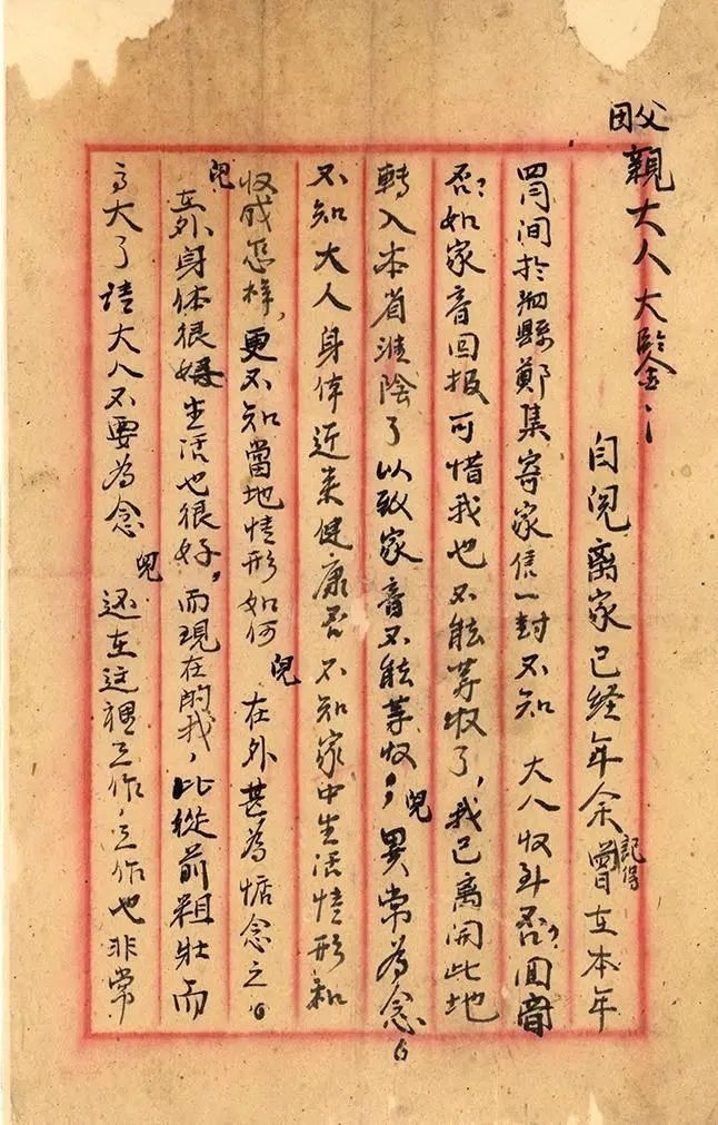 “自儿离家已经年余,记得曾在本年四月间,于泗县郑集寄家信一封,不知大人收到否?回音否?如家音回报,可惜我也不能等收了……”