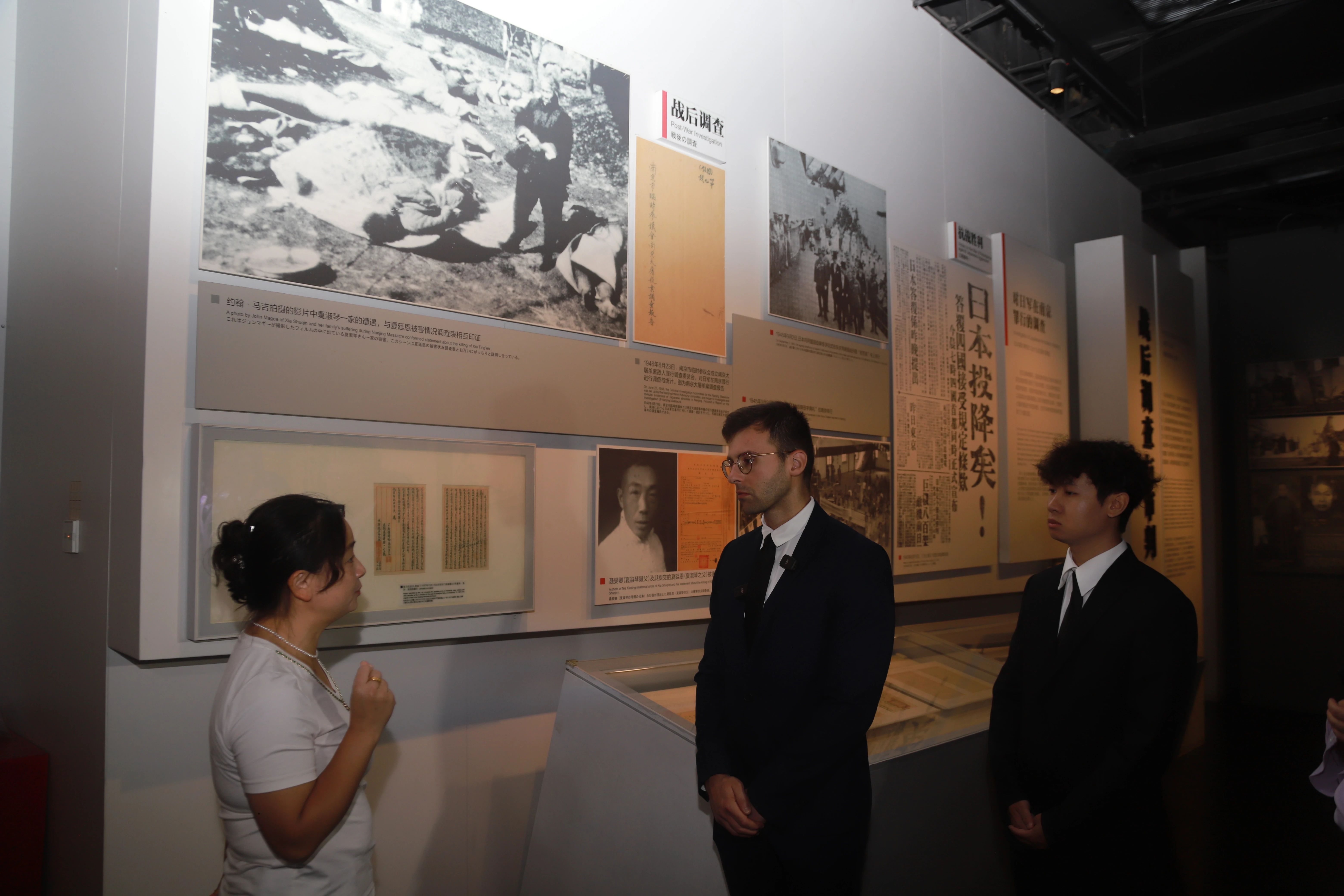 在介绍南京市民夏姓一家在南京大屠杀期间遭遇的展板前,南京大屠杀历史记忆传承人夏媛向马库斯一行讲述家族故事,当听到夏媛的外婆夏淑琴悲惨经历时,马库斯眉头紧锁,眼神中满是震惊与共情。