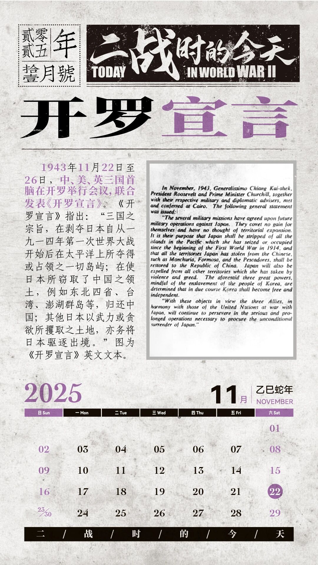 二战日历 | 《开罗宣言》发表 1943年11月22日至26日,中、美、英三国首脑在开罗举行会议,联合发表《开罗宣言》。《开罗宣言》指出:“三国之宗旨,在剥夺日本自从一九一四年第一次世界大战开始后在太平洋上所夺得或占领之一切岛屿;在使日本所窃取了中国之领土,例如东北四省、台湾、澎湖群岛等,归还中国;其他日本以武力或贪欲所攫取之土地,亦务将日本驱逐出境。”图为《开罗宣言》英文文本。