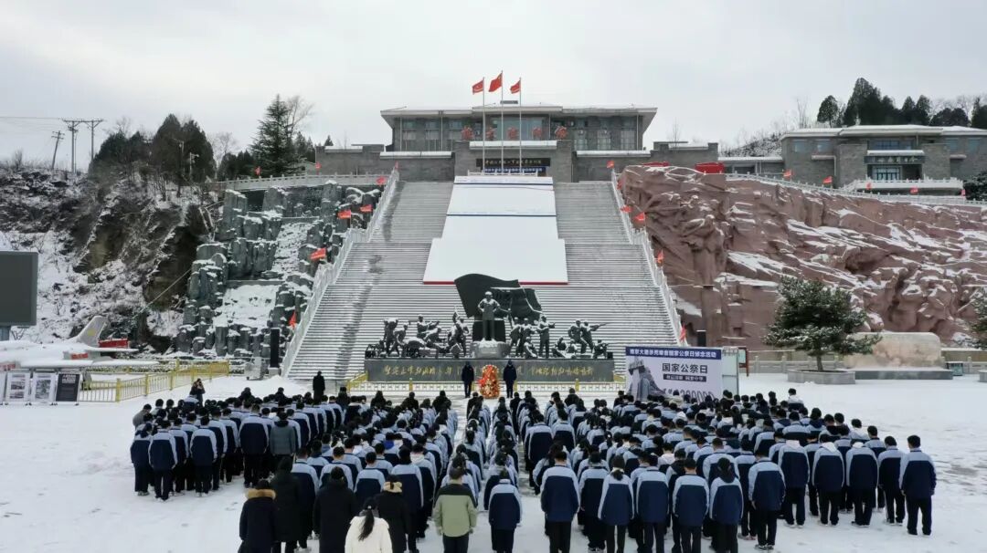 陕西延安。全体在场人员整齐列队,鲜艳的五星红旗在国歌声中缓缓升起,随着防空警报声的响起,在场人员怀着沉痛的心情低头默哀,向南京大屠杀遇难同胞致以最深切的哀悼。接着,纪念馆讲解员饱含悲愤与崇敬之情,朗诵《铭记历史 勿忘国殇》纪念文稿,字字铿锵,既倾诉着对遇难同胞的追思,更传递出以史为鉴、砥砺前行的坚定信念。
