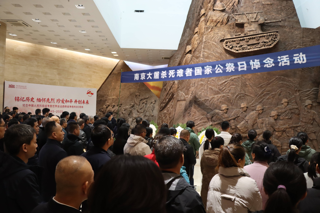 广东东莞。广东东江纵队纪念馆在纪念馆前广场举行南京大屠杀死难者国家公祭日同步悼念活动,形成了跨越时空的历史共鸣。来自粤港澳大湾区的党员代表、大学生、小学生及社会各界人士共400余人手持菊花,整齐肃立,共同参与这场缅怀历史、祈愿和平的仪式。东莞城市学院的学生代表诵读《和平宣言》,各界代表缓步走向题字碑墙,敬献鲜花。仪式结束后,全体人员参观基本陈列“东江铁流 南粤旌旗”。