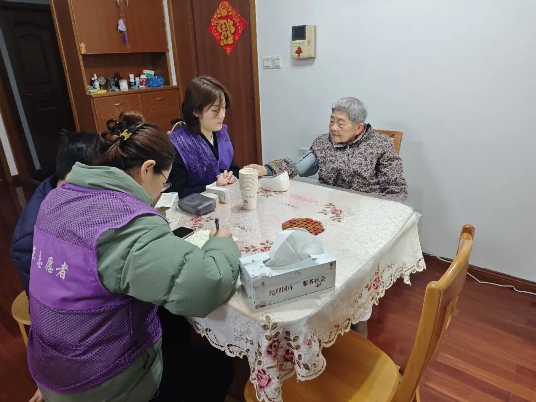 医护志愿者为程文英奶奶量血压