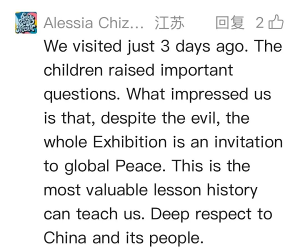 外国观众Alessia留言:“令我们深受触动的是,展览展现了那段罪恶的历史,也是向世界发出呼唤和平的邀请。这是历史给予我们最珍贵的启示。向中国及中国人民致以崇高敬意。”