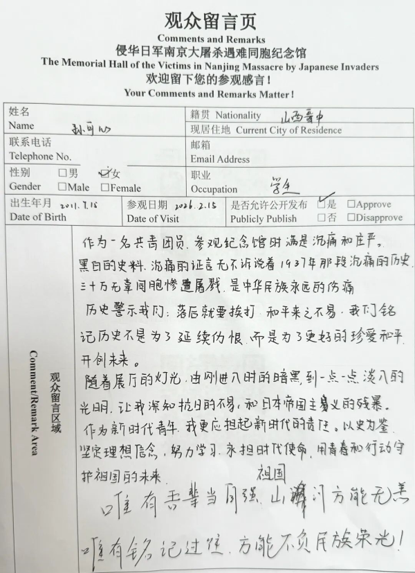 青少年观众在参观之后有了更多思考。“这惨绝人寰的屠杀是对人性的湮灭,对正义的践踏,是军国主义滋养出的失去良知与人类之光的耻辱……”来自福建福州的15岁花同学写下留言,笔迹清秀,情感炽烈。