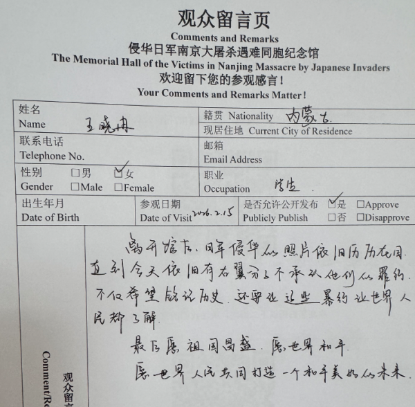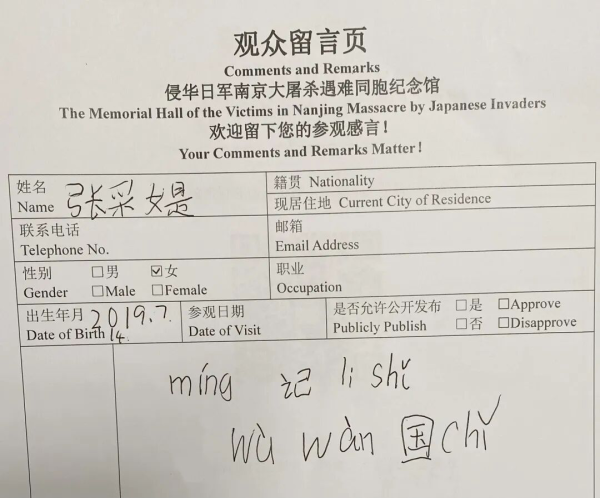 来自内蒙古的学生写道:“直到今天依旧有右翼分子不承认罪行。不仅希望铭记历史,还要让这些暴行让世界人民都了解。”