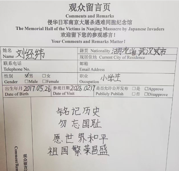 不同于寻常景点的祝福寄语,纪念馆里观众写下的每一行文字,都饱含对历史的敬畏、对和平的珍视。许多外国观众参观后真切地走近这段历史,表达了感同身受的共情,以及对世界和平的共同祈愿。