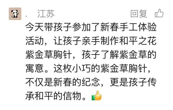 纪念馆新春主题活动,吸引不少亲子家庭参与,孩子们在沉浸式参与中收获力量。正如这位网友所言:“这不仅是新春的纪念,更是孩子传承和平的信物。”