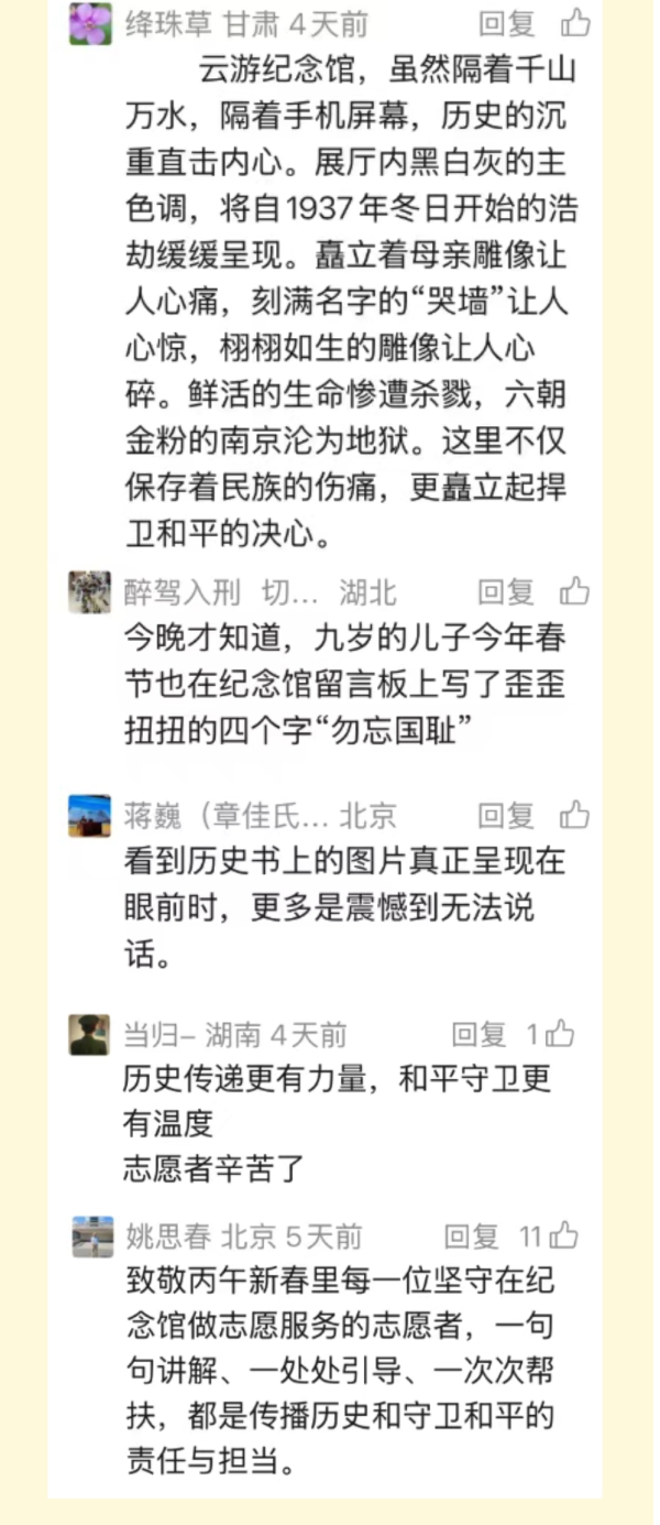 国外网友留言:“这在中国被称为国殇。我去年参观了纪念馆,内心真的碎了。多年来,我一直想向南京大屠杀遇难同胞致以哀思。世界需要知道当年日军在中国及其他亚洲国家所犯下的一切滔天罪行的真相。时隔近90年,日本仍在否认真相。‘否认真相,是更大的罪恶。’”