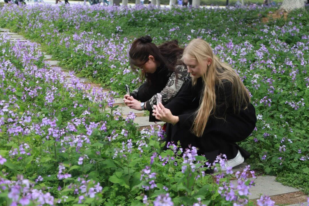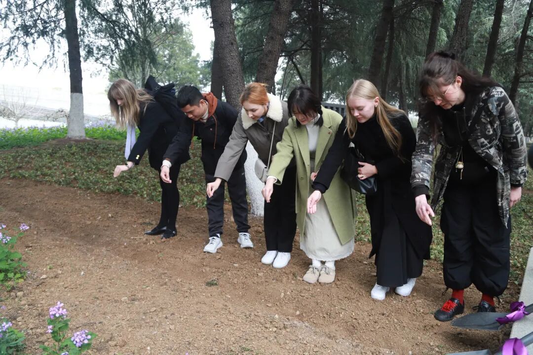 来自俄罗斯的留学生丽莎说:“这是我第一次播种紫金草,这朵紫色小花背后承载的意义让我深受触动,我会把这里的故事分享给更多人。”