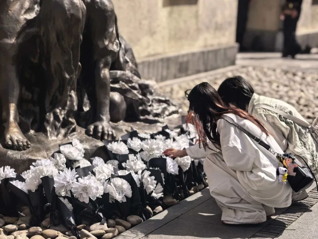 观众将亲手制作的纸花敬献于“慰安妇”主题雕塑前。不一会儿,雕塑前便摆满了承载着深切哀思的白花,寄托对日军“慰安妇”制度受害者的缅怀。