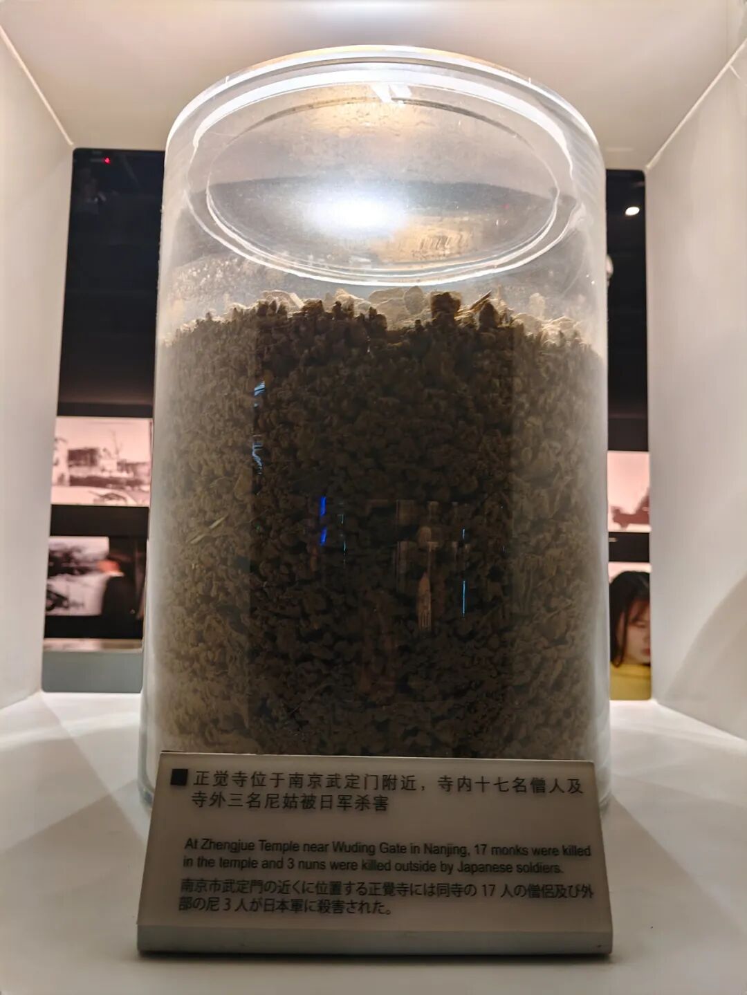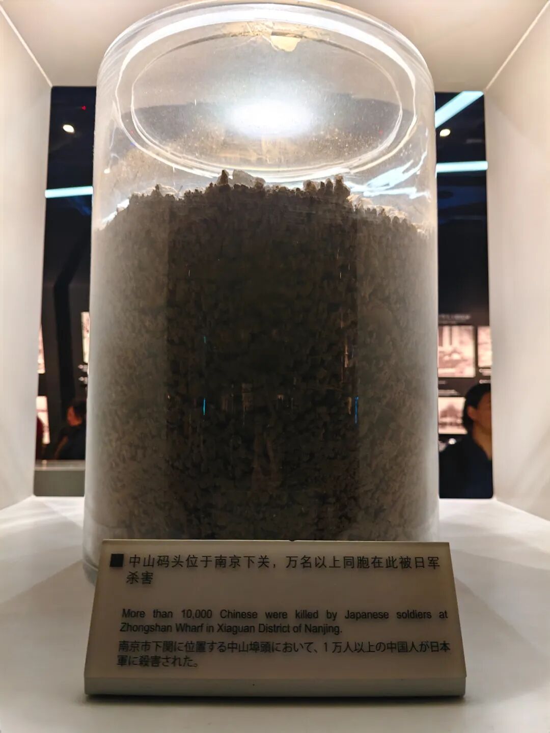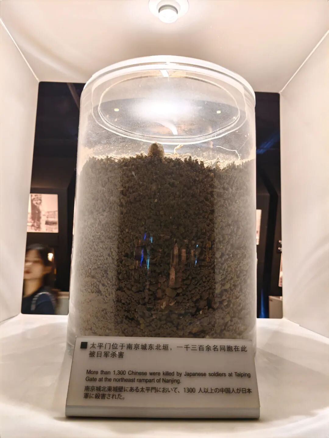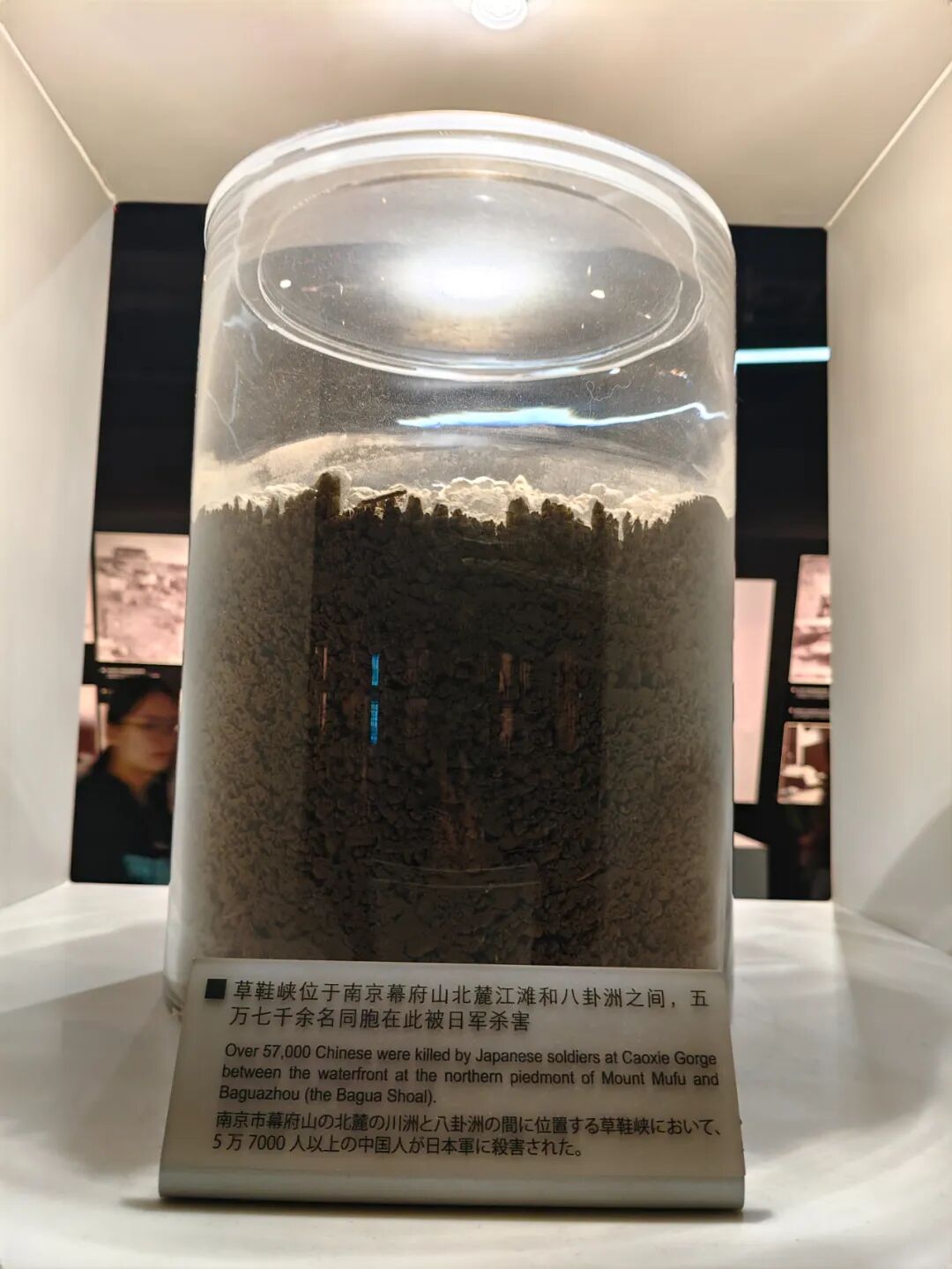 “你看图片说明上写着,这些土是从南京城各处南京大屠杀遇难同胞丛葬地和集体屠杀遗址采集来的。”